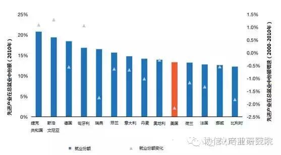 图 5 美国高端产业就业低于国际标准并下降迅速